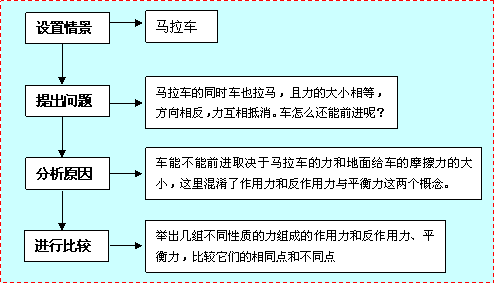 4.通过比较作用力和反作用力与平衡力之间的区别和联系,对新知识做进一步巩固理解,通过交流与讨论,让学生进一步了解作用力和反作用力的特点。
