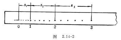 2.为了减小测量误差,舍去纸带上比较密集的点,从后面的一个比较方便的点开始,每隔相等的点(相等的时间间隔)取一个计数点(一般是取5个时间间隔),如图2.14-2所示。测出S1,S2,S3……记入自己设计的实验记录表中。