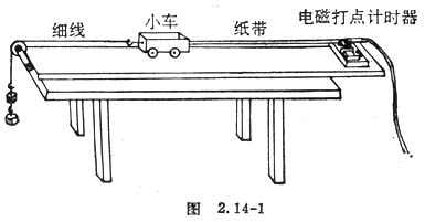 1.按图2.14-1把实验装置安装好,使小车停在打点计时器附近。接通电源后放开小车。在小车快靠近定滑轮时,使小车停止,止动打点计时器。取下已打点的纸带。换上新纸带,改变挂的钩码数,重做两次。