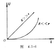 在分压接法中,滑动变阻器输出的电压范围是0≤U≤E。如果R>>r,在图4.5-5中,RAC≈r1,UAC=(r1/R)E,即输出电压与滑动变阻器电阻成线性变化。如果R<<r,可分两种情况讨论:(1)r1<R时,UAC≈(r1/R)E,即UAC随r1线性变化,考虑到R<<r,r1变化范围不会很大。(2)R<<r1时,UAC=(R/(R+r-r1))E所以在R<<r,时UAC和滑片移动的距离基本上按对数关系变化。如图4.5-6所示,上式中的r1与图中的L成正比。所以在分压接法中,电压调节范围大,且在R>>r时可以得U和L的线性关系,故实际电路中多采用分压接法。