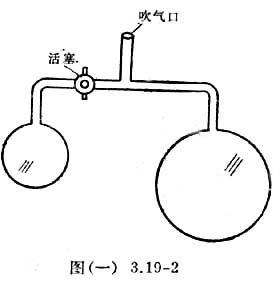 类似的实验还可以用肥皂泡来进行。用一只中间带活塞的三通管,在两侧管下涂少许肥皂液,分别吹气使两侧肥皂泡大小不一一,关闭中间活塞,堵住吹气口。然后,把中间活塞打开,使两个大小肥皂泡连通起来,如图(一)3.19-2所示,看看它们的大小将怎样变化?