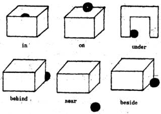 本单元要学12个新单词,还要复习以前学过的单词。应尽量扩大词汇的复习面。尽可能把本学期学过的词汇都过一遍。并结合Page171 workbook中的练习3,让学生们练习词的分类。此项练习,大体与中文相同,学生们做起来,不会感到很困难。本单元主要复习名词、介词、代词等。学习新单词尽量结合课文,做到“词不离句,句不离文”。复习此类单词,可再用图片(把书中的图用实物投影放大也可以),实物、简笔画等,都可以达到很好的效果。如:复习介词时,教师可带个大书包或盒子,将书本等物品放在不同的位置,还可利用几幅简笔画来表示: