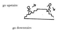2.用表情和动作教学 例如:教upstairs 和downstairs时,教师可用书中插图说明This man lives upstairs and this man lives downstairs. 又可用简笔画表示go downstairs / upstairs(如下图)而且还可做上下楼的动作示意。