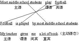 4.主动语态改写成被动语态的方法:将主动语态的宾语变成主语,将主动语态的谓语变成被动式be + 过去分词,主动语态的主语变成被动语态句中by的宾语(或省略)。如果主动语态中有两个宾语(直接宾语或间接宾语),可以把其中任意一个变成被动语态的主语。例如: