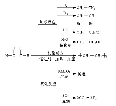 [总结] 乙烯属于烃,具有烃的一个通性——燃烧,由于含有C=C,又具有其特性,能被强氧化剂氧化,还能发生加成和加聚反应。