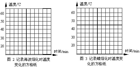 分析和论证:在图2和图3的方格纸上的纵轴表示温度,温度的数值已经标出;横轴表示时间,请你自己写上。根据表中各个时刻的温度在方格纸上描点,然后将这些点用平滑曲线连接,便得到熔化时温度随时间变化的图像。