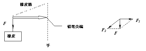 实验过程:将橡皮筋套在中指上,将铅笔与橡皮筋连接,铅笔尖端卡在手心处,体会一下铅笔的重力产生的效果,在铅笔上挂接上橡皮,思考拉力