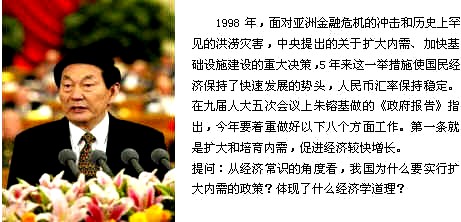 教师引导:从1998年以来,我国实行了扩大内需,实行积极的财政政策和稳健的货币政策,极大的促进了中国经济的发展。那么,中国为什么要实行这样的政策?这里面包含什么样的经济学原理呢?这个问题,课前我们已经分成4个小组分别就4个问题进行研究,下面由他们做汇报。