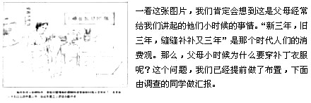 教师引导:现在虽然生活水平提高了,这只是和以前比我国现在解决了温饱问题,正在向小康迈进,但勤俭节约、艰苦奋斗作为中华民族的优良传统是不能丢的。现在提倡艰苦奋斗、勤俭节约不是表现位穿补丁衣服,而是适度消费,不搞超前消费,不盲目攀比。