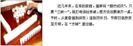 教师引导:家庭麻将,有损于家庭美德,有百弊而无一利:萎靡不振,影响工作;过度疲乏,积劳成疾;夜深“激战”,妨碍邻居;年老有病,急剧加重;赌博心理,逐日滋生;有害孩子,影响学业……。我们应该提倡积极正确的消费观念,把精力、钱财用到不断提高自身素质和修养的消费方面。