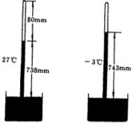 例题 一水银气压计中混进了空气,因而在27℃,外界大气压为758毫米汞柱时,这个水银气压计的读数为738毫米汞柱,此时管中水银面距管顶80毫米,当温度降至-3℃时,这个气压计的读数为743毫米汞柱,求此时的实际大气压值为多少毫米汞柱?