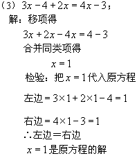 【教法说明】通过以上两题进一步印证移项这种变形的规律,即“移项要变号”.要使学生认清这里的移项是把某项从方程的一边移到另一边而不是在同一边交换位置,弄懂解方程的书写格式是方程在变形,变形时保持“左右两边相等”这一数学模式.