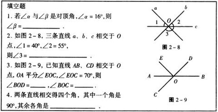 【教法说明】例题一方面巩固了对顶角的性质;另一方面说明几何里的计算题,需要用到图形的几何性质,因此,要有根有据地计算.例题放手让学生自己解决,比教师单纯地讲解效果会更好.尽管学生书写格式不如课本上的规范,但通过集体讲评纠正后,学生印象更深刻.