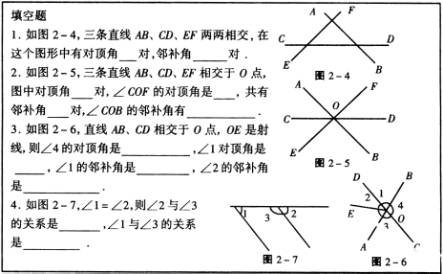 为此,对顶角有 2×3=6个,邻补角的对数为 4×3=12个.第3、4题是有关的概念的综合训练,其中第4题意在区别互为补角和互为邻补角的概念.