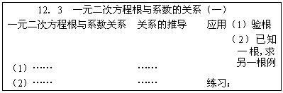 (12) 一元二次方程根与系数的关系的推导是在求根公式的基础上进行。它深化了两根的和与积和系数之间的关系,是我们今后继续研究一元二次方程根的情况的主要工具,必须熟记,为进一步使用打下基础。