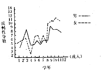 图是以美国心理学家对小学一年级学生至成年人进行大规模有组织的的创造性思维测验后,根据其中的流畅性分数绘制的曲线图.