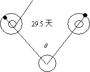 例2 若近似认为月球绕地球公转与地球绕日公转的轨道在同一平面内,且都为正圆.又知这两种转动同向,如图所示,月相变化的周期为29.5天(图是相继两次满月,月、地、日相对位置示意图).
