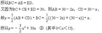 例1、如图,苗圃的形状是直角梯形ABCD,AB∥DC,BC⊥CD.其中AB,AD是已有的墙,∠BAD=135°,另外两边BC与CD的长度之和为30米,如果梯形的高BC为变量x(米),梯形面积为y(米2),则y与x的关系式是______.