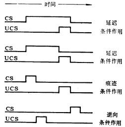 巴甫洛夫条件作用的基本特征,是通过条件刺激与无条件刺激的配对引起条件反射,在实验中,条件刺激与无条件刺激可以有多种配对方法(见图4)。由于条件刺激在条件作用过程中起信号的作用,预示无条件刺激的到来,因此,在逆向条件作用过程中,条件刺激在无条件刺激之后出现,这就起不到预报或信号的作用,因而不可能建立条件反射