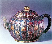 宜兴紫砂壶艺术成就很高,名家辈出,成就最高的要数明代时大彬及弟子李仲芳、徐有良等,清代则以陈鸣远为代表。壶底或壶把下方等处落下作者名款,明为阴刻,清为铃印。北京故宫博物院藏有一件万蝠纹紫砂执壶(见图)造型秀雅,为清乾隆时期典型茶具。器呈瓜楞形,口沿、圆腹、圈足,隆起的盖面及圆形钮,皆模制瓜楞形,腹两侧有弯形流与曲形柄。通体施蓝彩为地,用红彩、金彩绘云头、红蝠、万字带纹,构成“万代安福”吉祥图案,这为传世珍宝。