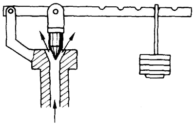 也是利用重锤的方法,但把重锤挂在横杆上,杆的支点在最左端,中间是锅炉的排气孔.当压力过高的时候,蒸汽把横杆连同重锤顶起来,一时锅炉内的蒸汽排除压力下降.而且可以通过调节重锤离左端的距离来改变所限制的压力值.