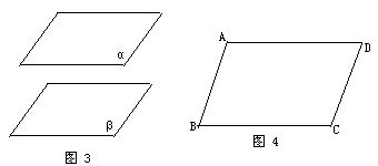 如果两个平面没有公共点,叫做两个平面互相平行.图3中,平面α平行于平面β,记作α∥β.