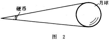 当我们已知月球离我们的距离时,就可以测定月球直径的大小。 如图2,把一个五分的硬币(直径2.4厘米),放在离眼睛2.6米的地方,大致能够把整个月面遮住。(试一试!)