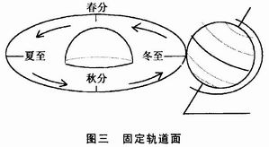 2.用自制的地球仪演示地球的公转,提醒学生注意:演示时,公转轨道面模型与地球仪的交点就是太阳直射点。先将地球仪放在冬至的位置,将公转轨道面移至南回归线上,固定轨道面,如图三所示。水平移动地球仪到春分、夏至、秋分其他三个位置,观察有什么现象发生?