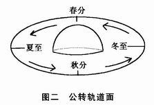 1.对照教材第11页的地球公转示意图,在地球公转轨道面上标出冬至、春分、夏至、秋分四个点,并用箭头标出地球公转的方向,如图二所示。