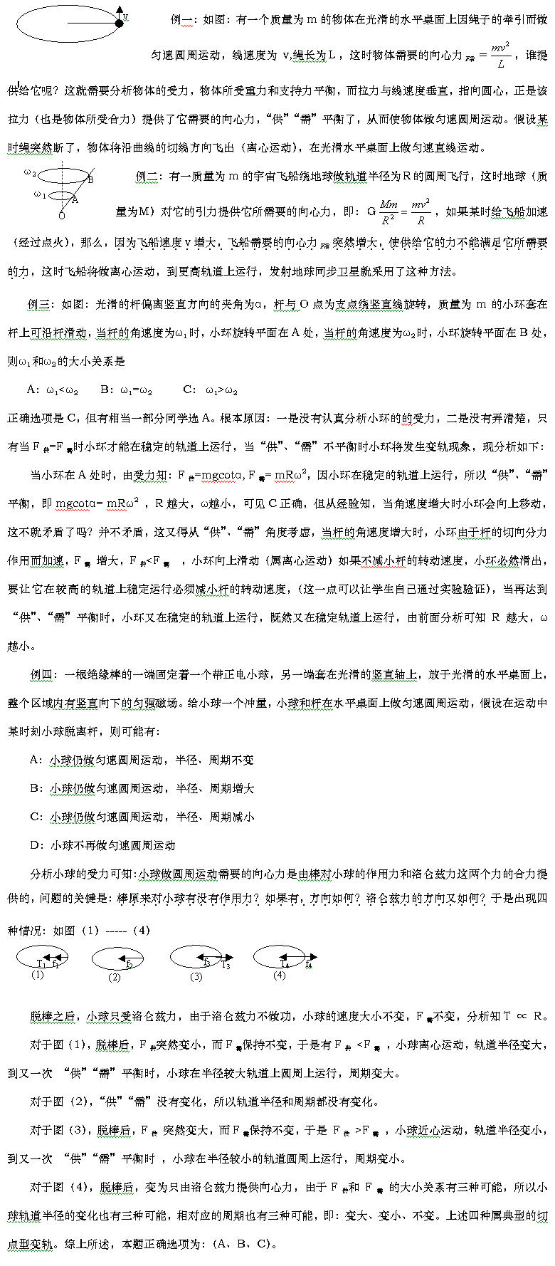 分析物体做圆周运动时,必须首先让学生弄明白两个问题:一是物体需要的向心力,二是谁提供它需要的向心力,只有当提供的力能满足它需要的向心力时,即“供”与“需”平衡时,物体才能在稳定的轨道上做圆周运动,否则物体将发生变轨现象——物体远离圆心或靠近圆心。