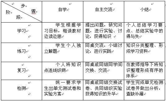 “自主探究——评价法”在具体操作中,教师要根据教材、教学大纲、知识内在规律、学生实际水平深度,将每个知识单元的学习分成四个阶段:学习、练习、复习、检测,设计学习程序,指导学生自学(主要学习实验方法)、实验交流、小结。各项概述如下: