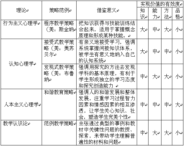 教学策略是教育工作者为实现某种教学目标而制定的教学实现方案。它包括一定的教学思想指导下,依据符合教学规律的教学原则,选择和组织各种方法、材料,确定师生行为程序等内容。选择有效的教学策略是实现教学目标、提高教学效率的重要环节。很明显,不同的教学策略对教学价值的实现的有效程度是不同的。下面我们把一些比较典型的教学策略对不同的教学价值的有效度分析如下: