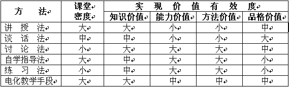 教学方法是指在一定的教育思想指导下,为达到教学目标而采用的教学方式、方法及组织形式的总和。思想政治课的教学方法是隐性方法和显性方法共同构成的有机整体。教师在备课过程中,对知识进行"内化"所使用的观察方法、认识方法和思维方法是思想政治课的隐性教学方法;教师在课堂教学中,对知识进行"外化"所采用的组织形式和具体方法是思想政治课的显性教学方法。我们平常所讲的教学方法主要是指显性教学方法。很明显,不同的教学价值需要不同的教学方法。为了充分实现政治教学价值,我们将不同教学方法对教学价值的实现的作用分析如下: