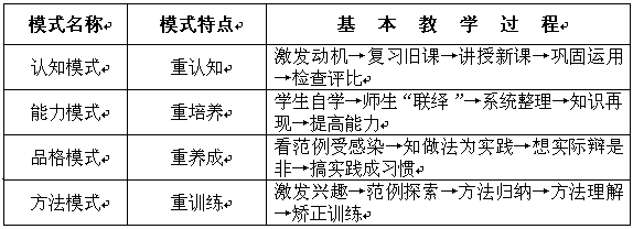 教学模式是在一定教学思想指导下所建立的比较稳定、典型的教学结构框架或活动程序。在教学过程中,教学模式是最富活力的教学环节,是教学改革中最广、最有潜力发挥的领域。在政治教学过程中,知识价值、能力价值、方法价值和品格价值既互相关联、彼此互动,又有不同的形成过程。不同的形成特性要求教学采取与形成特性相适应的教学活动形式。知识价值的形成特性是主体反映客体,与其形成特性相适应的教学活动形式是认知;能力价值的形成特性在于主体与客体的相互作用,与其形成特性相适应的教学形式是培养;方法价值的形成特性在于主体将关于操作要求的认识转化为主体的操作过程,与其形成特性相适应的教学活动形式是训练;品格价值的形成特性在于主体认识系统、情意系统、行为系统的和谐发展,达到主客观的统一,与其形成特性相应的教学活动形式是养成。根据不同教学价值的形成特性,我们可以形成以下教学模式: