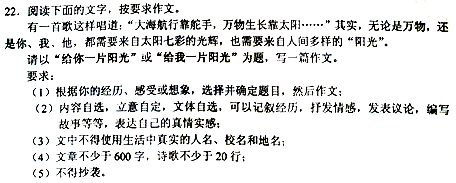2012广西玉林、防城港中考作文题目是《给你(我)一片阳光》。