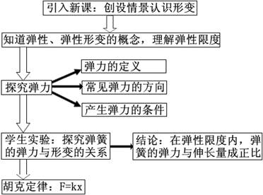 ●由于大量的力学现象中都要对弹力的产生条件及其方向进行判断,并且要明确相互接触的物体是否产生弹力及方向如何?而且弹簧所产生的弹力贯穿知识的前后,因此我把重点内容确定为: