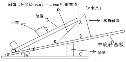如图4,老师介绍方案2的实验仪器的使用:中旋转基板定位于图3中BD位置。三角斜面插入轨道,将轨道相对中旋转基板转过一定的角度,由米尺1测量出AD(sinθ-μcosθ)的数值,得到F合力的绝对数值。也可以通过斜面上的刻度AE直接读出AD(sinθ-μcosθ)的数值。米尺就不需要了。AE对AD还起到放大作用。