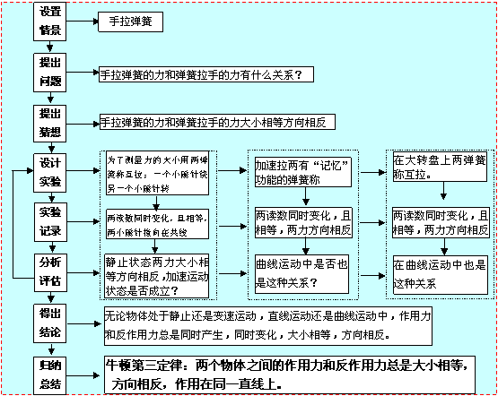 2.采用探究式教学方法,通过实验手段,探究作用力和反作用力的关系,结合事实资料,得出作用力和反作用力的关系,归纳得出牛顿第三定律。让学生新身体验科学研究方法,培养学生的实验能力、交流与协作的团队精神以及求真、求实的科学态度。
