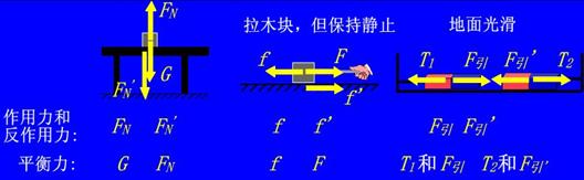 〖分析〗车能不能前进取决于马拉车的力和地面给车的摩擦力的大小,这里混淆了作用力和反作用力与平衡力这两个概念。首先展示下图所示几种不同性质的力,让学生分别找出作用力和反作用力与平衡力,然后比较相同点与不同点。同时得出作用力的反作用力的另一个特点:异物,同性,同时。