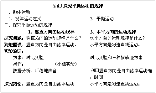 1.设计思想:本节课的教学力求贯彻新课程体验,采用探究式教学,引导学生通过实验探究形成对抛体运动的认识;让学生在获得知识的同时,体验科学探究过程,了解科学研究方法,发展探索自然的兴趣与热情,培养实验探究能力和交流协作能力。