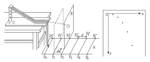 。把覆盖复写纸的白纸铺贴在硬板B上。实验时依次将B板插入A板的各插槽中,每次让小球从斜轨的一同位置由静止释放。每打完一点后,把B板插入后一槽中并同时向纸面内侧平移距离