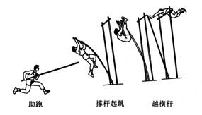 例2:如图所示,表示撑杆跳运动的几个阶段:助跑、撑杆起跳、越横杆。试定性地说明在这几个阶段中能量的转化情况。