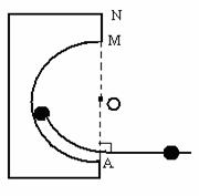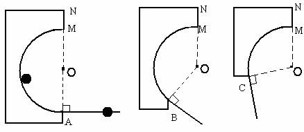 1、教师先演示投影:把小钢珠放在黑墨水瓶盖里转一下(内有一点点墨水),再放在半圆形有机玻璃轨道上运动并飞出,让钢珠在白纸上留下痕迹,同样在3/5半圆周,4/5半圆周上运动飞出,让学生猜测飞出方向由什么特点?(有机玻璃板说明:厚约5毫米,略小于小钢珠直径,圆弧半径15厘米,MN边稍长些,以便过MN做直线,根据半径大小确定圆心O位置。)