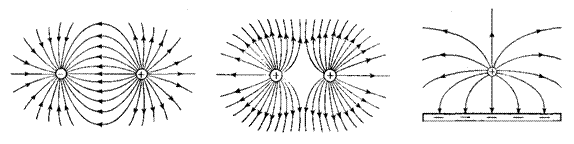 (1)等量异种电荷的电场线;(2)等量同种电荷的电场线;(3)点电荷与带电平板间的电场线。