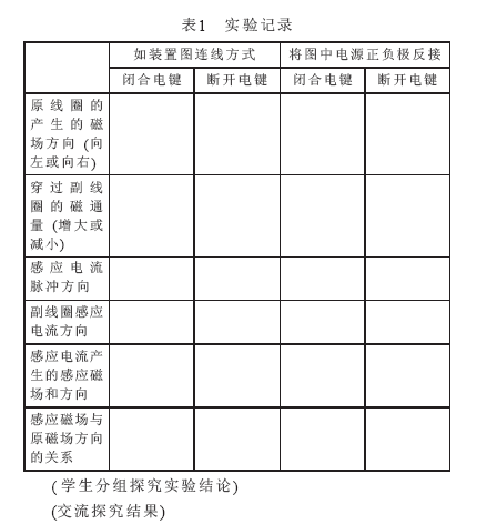 “楞次定律”是高中物理电磁学部分的重要内容,也是高中教学的难点。传统的教学设计是:教师演示实验→学生观察实验→教师引导学生分析得出楞次定律→讲解例题→课堂训练→课后巩固。在通常物理教学过程中对“楞次定律”的探究采用的是表格法,即收集原磁场方向、磁感应强度的变化、感应磁场方向、感应电流方向等多个研究变量的信息,然后分析多个变量的关系,归纳总结得出结论。按照这样的流程操作,虽然也能让学生学会如何应用楞次定律来判断感应电流的方向,但不难看出这种教学模式仍为“师传生受”,学生还是被动地接受知识,即使学会了,也不能算会学,而且学生的创新精神和实践能力亦难以得到进一步培养,教学实践表明这种分析归纳方法由于涉及相关因素太多,学生找出规律较为困难。面对新课程改革的要求,为营造一个让学生自主学习的良好环境,本节内容采用“探究式”教学,即:“创设一个问题情境→学生讨论→猜想→设计实验→探索实验→分析实验现象→得出楞次定律→课堂讲练→巩固练习”。这样通过让学生自己动手操作、动眼观察、动脑思考,引导他们自己获取知识,不仅活跃了课堂气氛,还发展了学生的思维能力和创新能力。