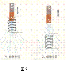 实验二:如图5所示,磁铁插入线圈时磁场由弱变强,磁铁由线圈抽出时,磁场由强变弱,即通过线圈B的磁场强弱变化时,可以产生感应电流。