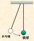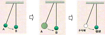 现象3:乒乓球A与铁球B球(mA<mB),B球静止,拉起乒乓球A,放开后A与B碰撞,乒乓球A差不多以等速反弹摆起,B球仍静止。