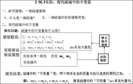 1.设计思想:新教科书关于动量的教学,与过去相比变化很大。突出了两点:体现学习中的探究精神;强调物理学中“不变量”的思想。编者的逻辑线索与特级教师黄国龙《新课程背景下物理探究教学模式理论》一脉相承。基于学习并体会“科学探究”与“实验探究”这两种教学模式相结合的实践活动。通过实验情境从特殊到一般化探究,让学生体验碰撞中不变量的猜想认知过程;让学生在实验探究引导和实践中收获“不变量的猜想”成果,体验学习探究过程,了解碰撞前后物块速度的获得方法,发展对学科的兴趣与热情,培养实验探究能力和交流协作能力。