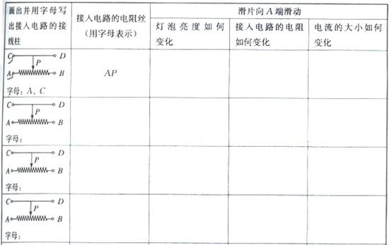 2.在滑片移动过程中,每种连接中连入电路的电阻如何变化?有无规律可循?设计一个实验表格,如图所示。