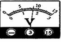 量程和分度值:接“-”和3时量程是0~3V,分度值是0.1V。接“-”和15时量程是0~15V,分度值是0.5V。